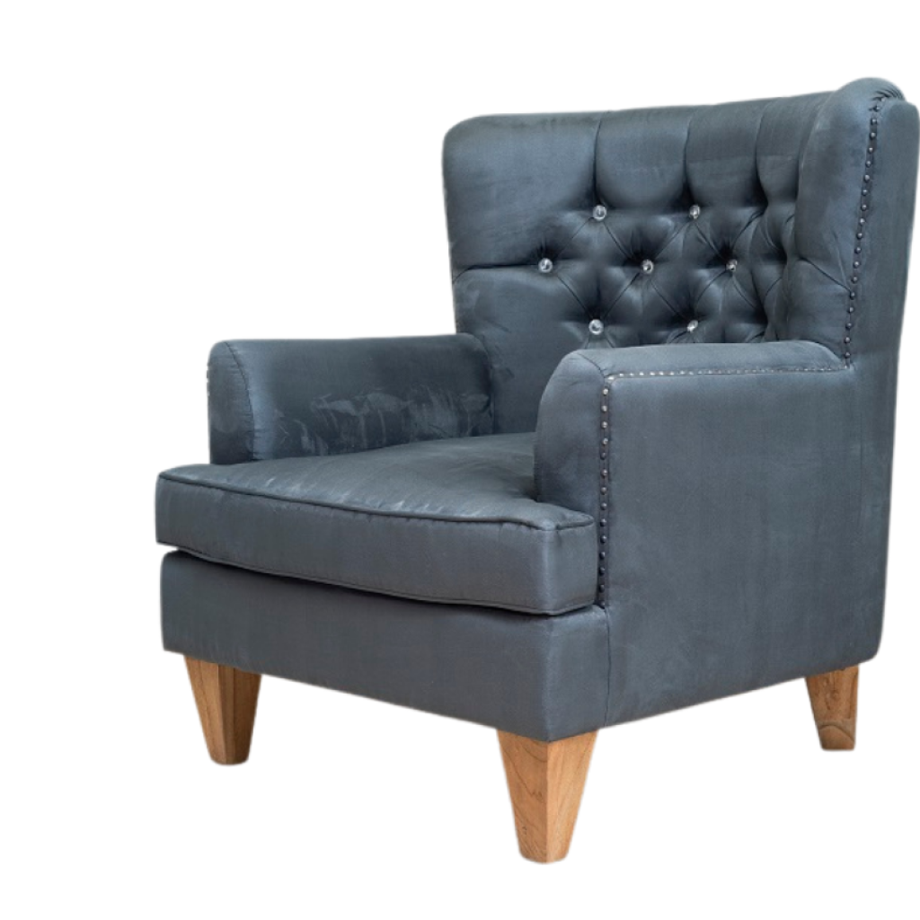 Luxusní celočalouněné křeslo v látce alcantara Suede Granite lemované kovovými cvoky.